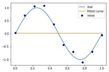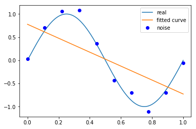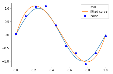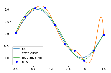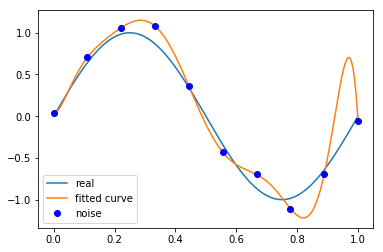 举例:用目标函数\(y=sin2{\pi}x\), 加上一个正态分布的噪音干扰,用多项式去拟合