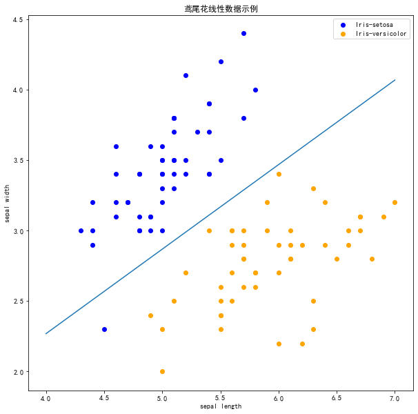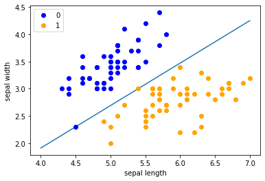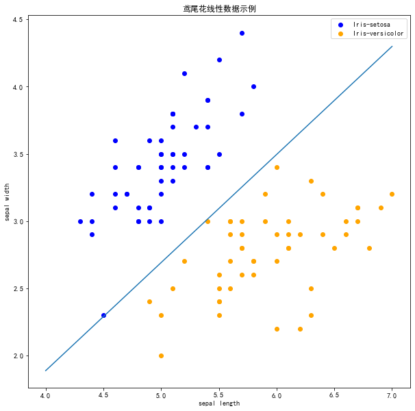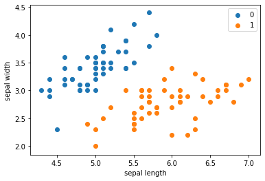 数据集中两个分类的数据和[sepal length,sepal width]
