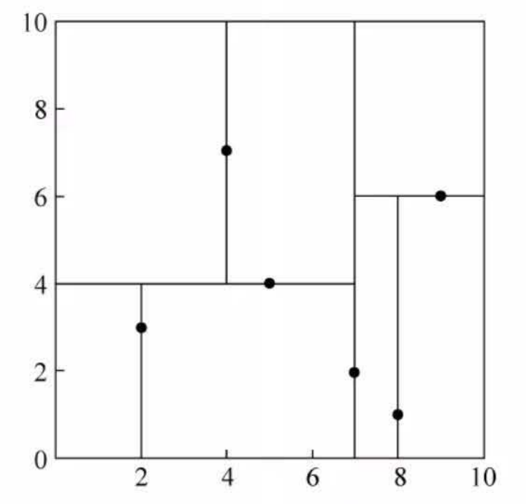 构造根结点,使根结点对应于\(k\) 维空间中包含所有实例点的超矩形区域;通过下面的递归方法,不断地对\(k\) 维空间进行切分,生成子结点。在超矩形区域(结点)上选择一个坐标轴和在此坐标轴上的一个切分点,确定一个超平面,这个超平面通过选定的切分点并垂直于选定的坐标轴,将当前超矩形区域切分为左右两个子区域(子结点);这时,实例被分到两个子区域。这个过程直到子区域内没有实例时终止(终止时的结点为叶结点)。在此过程中,将实例保存在相应的结点上。