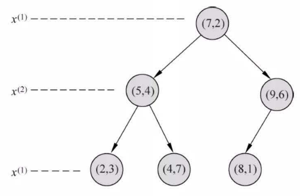 (2)重复:对深度为\(j\) 的结点,选择\(x^{(1)}\) 为切分的坐标轴,\(l=j(modk)+1\) ,以该结点的区域中所有实例的\(x^{(1)}\) 坐标的中位数为切分点,将该结点对应的超矩形区域切分为两个子区域。切分由通过切分点并与坐标轴\(x^{(1)}\) 垂直的超平面实现。