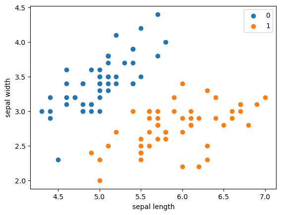plt.scatter(df[:50 ]['sepal length' ], df[:50 ]['sepal width' ], label='0' ) plt.scatter(df[50 :100 ]['sepal length' ], df[50 :100 ]['sepal width' ], label='1' ) plt.xlabel('sepal length' ) plt.ylabel('sepal width' ) plt.legend()