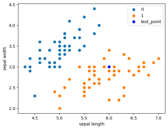 plt.scatter(df[:50 ]['sepal length' ], df[:50 ]['sepal width' ], label='0' ) plt.scatter(df[50 :100 ]['sepal length' ], df[50 :100 ]['sepal width' ], label='1' ) plt.plot(test_point[0 ], test_point[1 ], 'bo' , label='test_point' ) plt.xlabel('sepal length' ) plt.ylabel('sepal width' ) plt.legend()