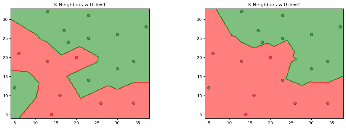 titles = ('K Neighbors with k=1' , 'K Neighbors with k=2' ) fig = plt.figure(figsize=(15 , 5 )) plt.subplots_adjust(wspace=0.4 , hspace=0.4 ) X0, X1 = X_train[:, 0 ], X_train[:, 1 ] x_min, x_max = X0.min () - 1 , X0.max () + 1 y_min, y_max = X1.min () - 1 , X1.max () + 1 xx, yy = np.meshgrid(np.arange(x_min, x_max, 0.2 ), np.arange(y_min, y_max, 0.2 )) for clf, title, ax in zip (models, titles, fig.subplots(1 , 2 ).flatten()): Z = clf.predict(np.c_[xx.ravel(), yy.ravel()]) Z = Z.reshape(xx.shape) colors = ('red' , 'green' , 'lightgreen' , 'gray' , 'cyan' ) cmap = ListedColormap(colors[:len (np.unique(Z))]) ax.contourf(xx, yy, Z, cmap=cmap, alpha=0.5 ) ax.scatter(X0, X1, c=y_train, s=50 , edgecolors='k' , cmap=cmap, alpha=0.5 ) ax.set_title(title) plt.show()
