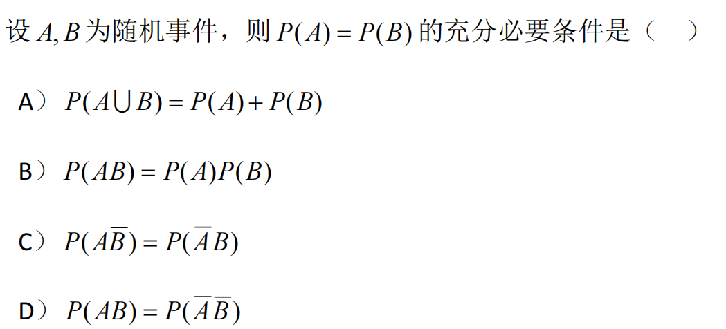 \(P(A\bar{B})=P(A-B)=P(A)-P(AB)\) , \(P(\bar{A}B)=P(B-A)=P(B)-P(AB)\) 又 \(P(A\bar{B})=P(\bar{A}B)\)