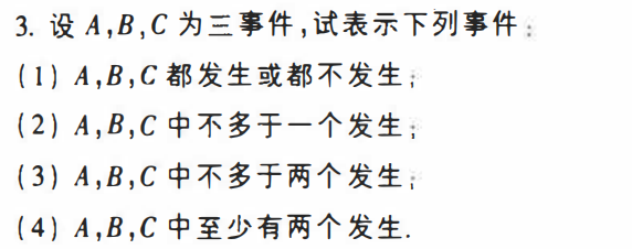 (3):唯一不符合的情况是 \(ABC\) 同时发生,所以可以写为 \(\Omega-ABC=\overline{ABC}=\bar{A} \cup \bar{B} \cup \bar{C}\)