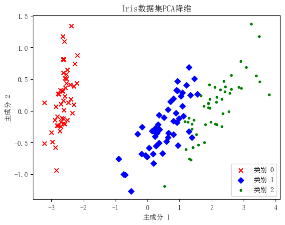 通过观察图中不同颜色点的分布,可以发现: - Iris-setosa (类别 0 ) 与其他两类在降维后的空间中分布较为独立,显示出明显的分离。 - Iris-versicolor (类别1) 和Iris-virginica (类别2) 有部分重叠,表明这两类在原始特征空间中的某些属性比较接近。
