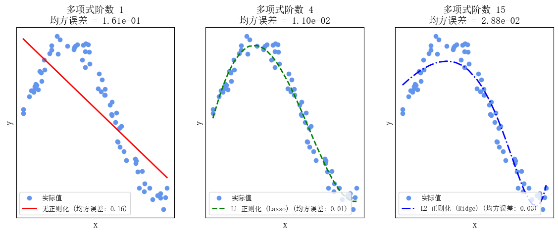 下面举例使用一个多项式函数作为目标函数, 然后分别演示不使用正则化、使用L1正则化 (Lasso回归)和使用L2正则化(Ridge回归)的情况。
