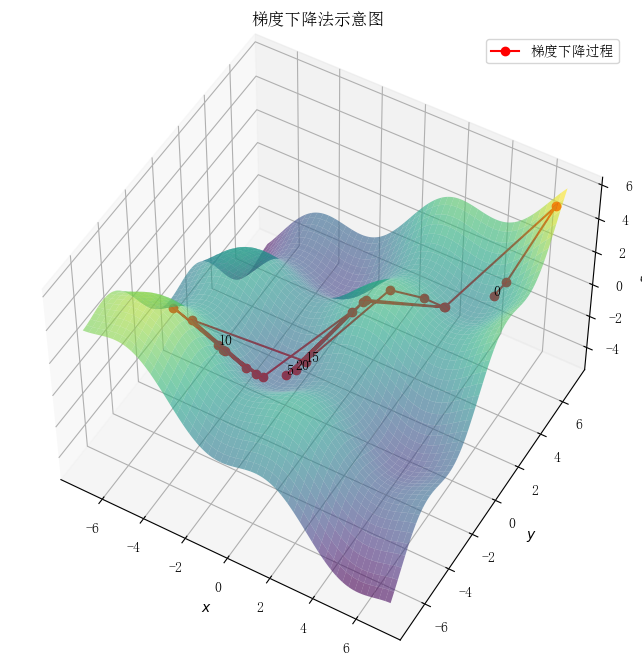 梯度下降法的直观类比 可以将梯度下降法类比为一个人在山谷中行走,试图找到最低点。在每一步中,这个人会评估当前所在位置的坡度,并朝着坡度最陡的下坡方向前进。通过不断地调整方向和步伐,这个人最终会到达谷底,即找到最小损失的参数组合。